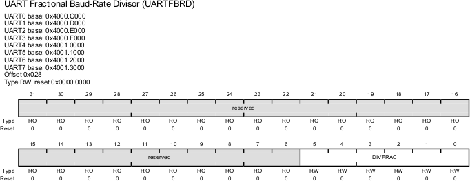 | UARTFBRD | 0x028 | UARTn_FBRD_R | UART Fractional Baud-Rate Divisor |