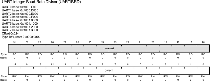 | UARTIBRD | 0x024 | UARTn_IBRD_R | UART Integer Baud-Rate Divisor |