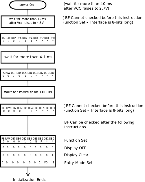 LCD runs much slower than the micro controller. The first two commands in the above table take up to 1.64 ms to execute and all the other commands and data take up to 40 us. After one command or data is written to the LCD controller, one must wait until the LCD controller is ready before issuing the next command/data otherwise the second command/data will be ignored. An easy way is to delay the microcontroller for the maximam time it may take for the previous command.